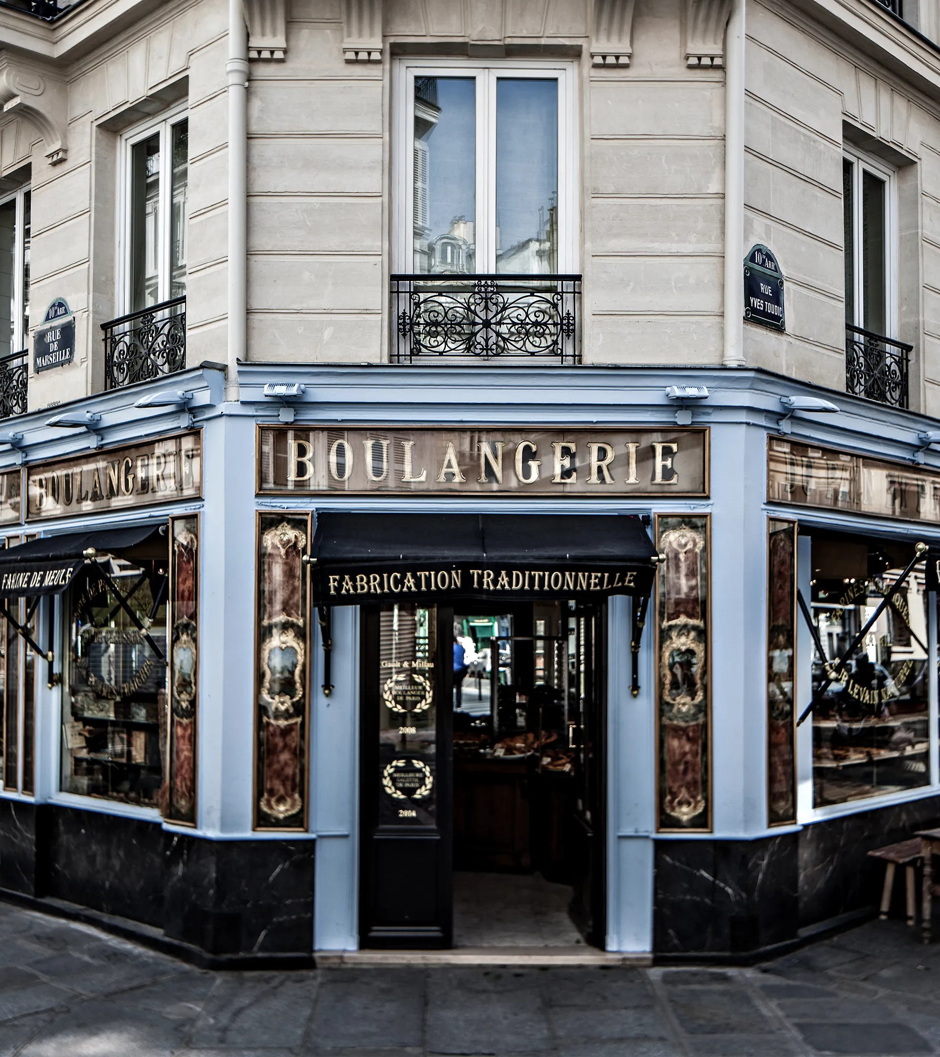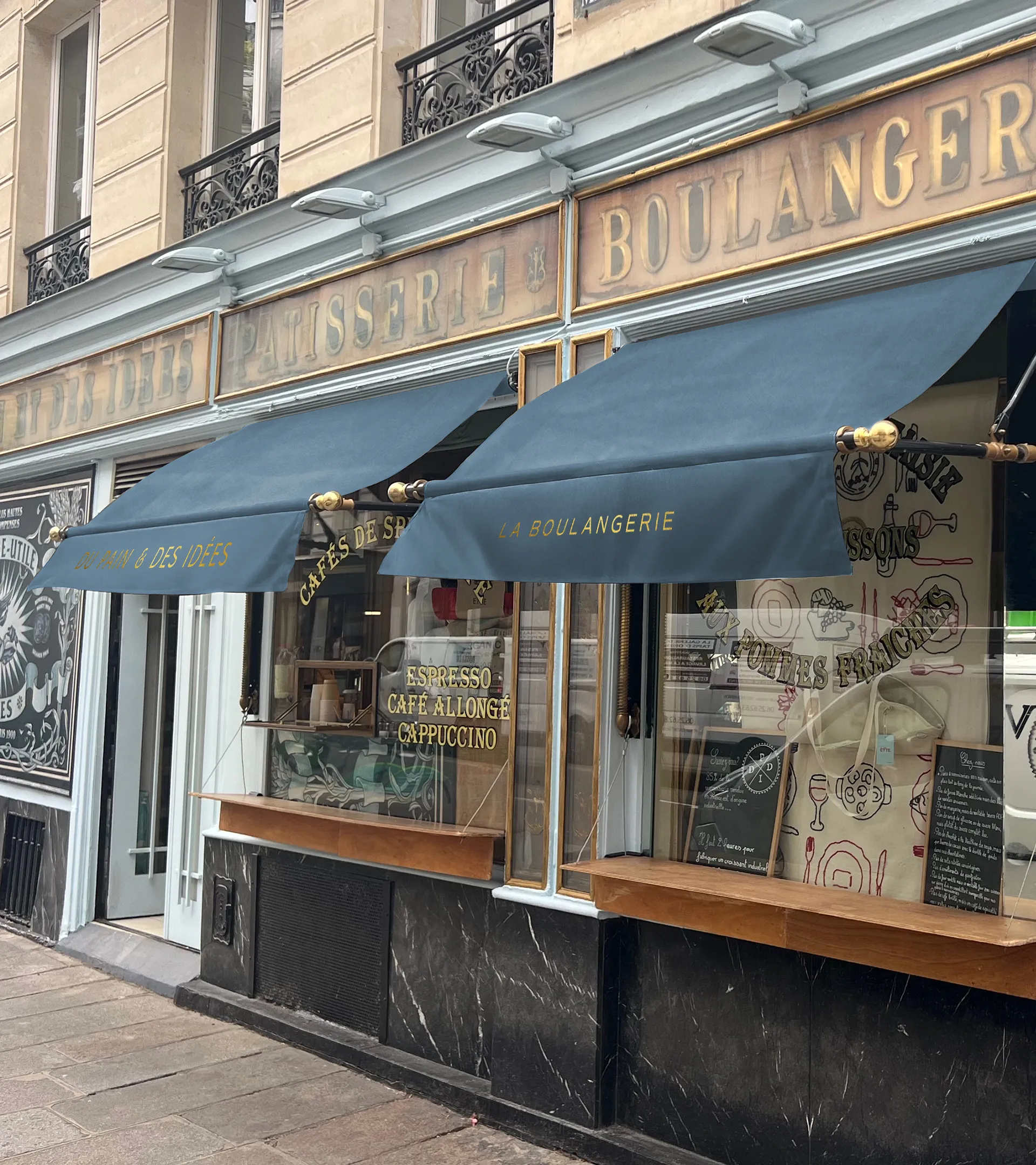 La palette chromatique scelle cette union : le bleu clair historique de la devanture se marie à un bleu-gris glacier profond et un noir structurant, apportant élégance et relief à l'ensemble.