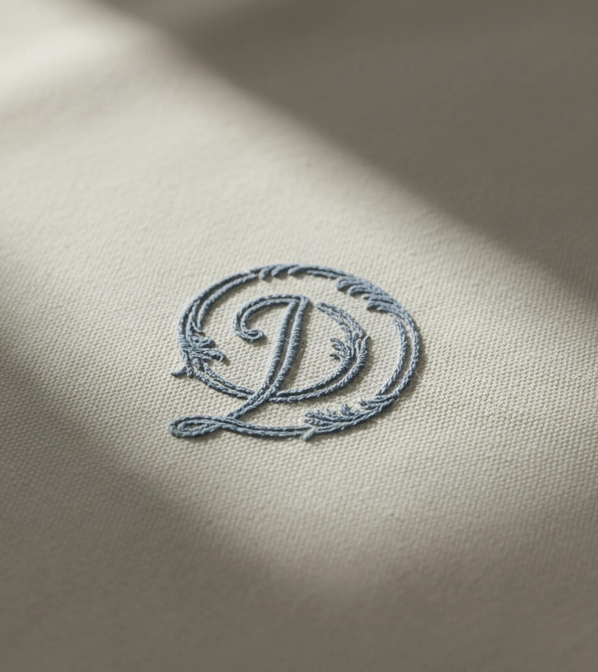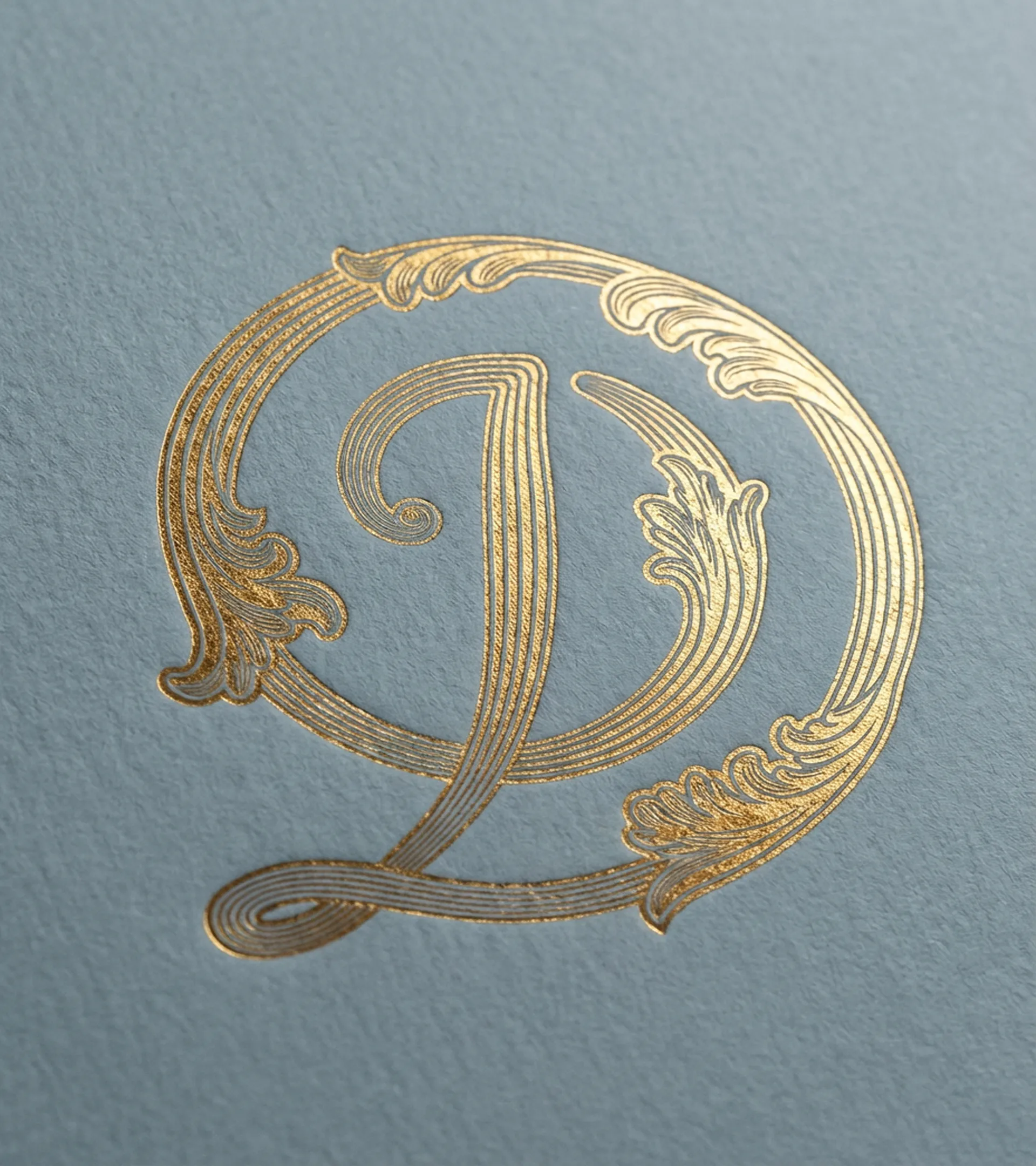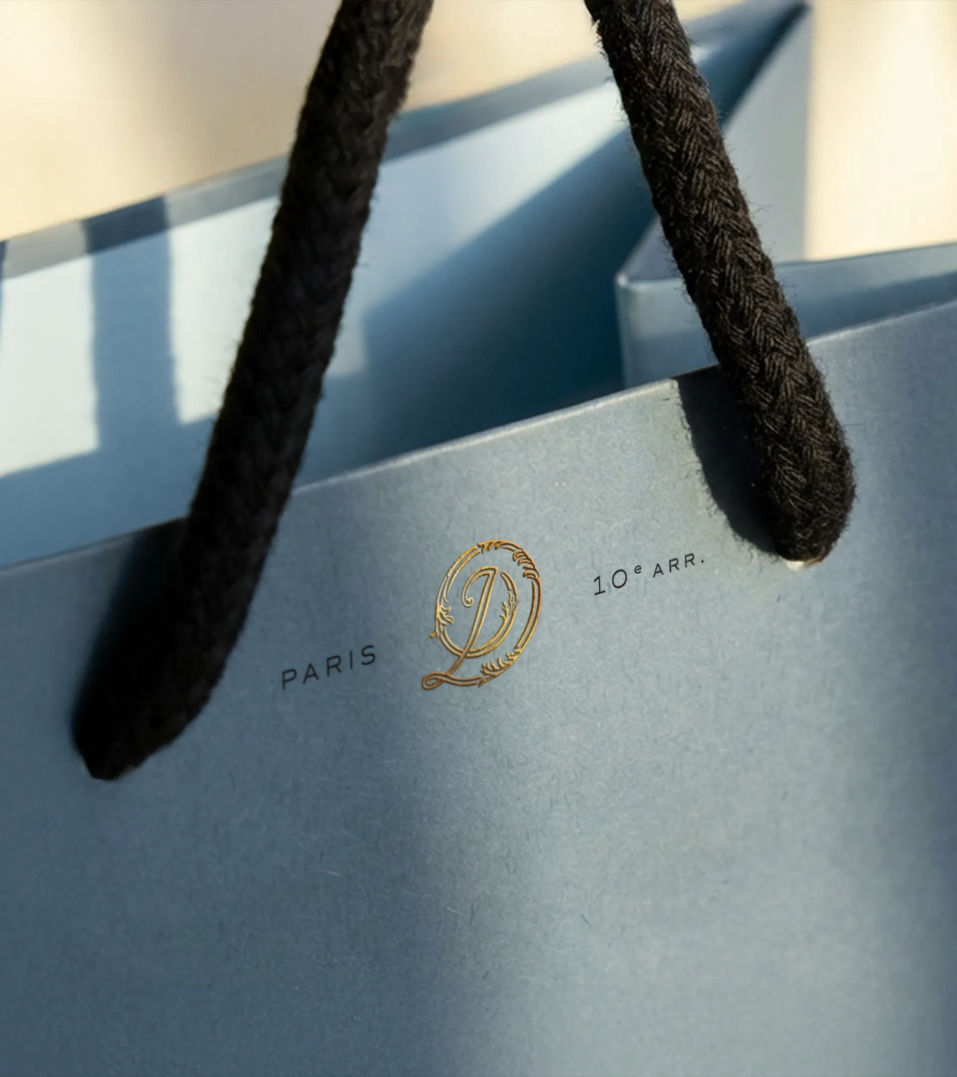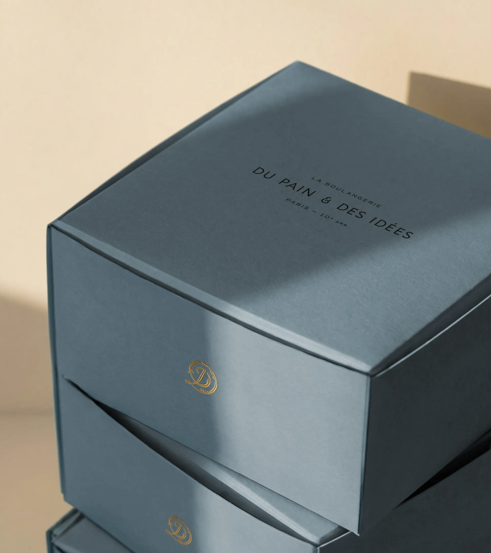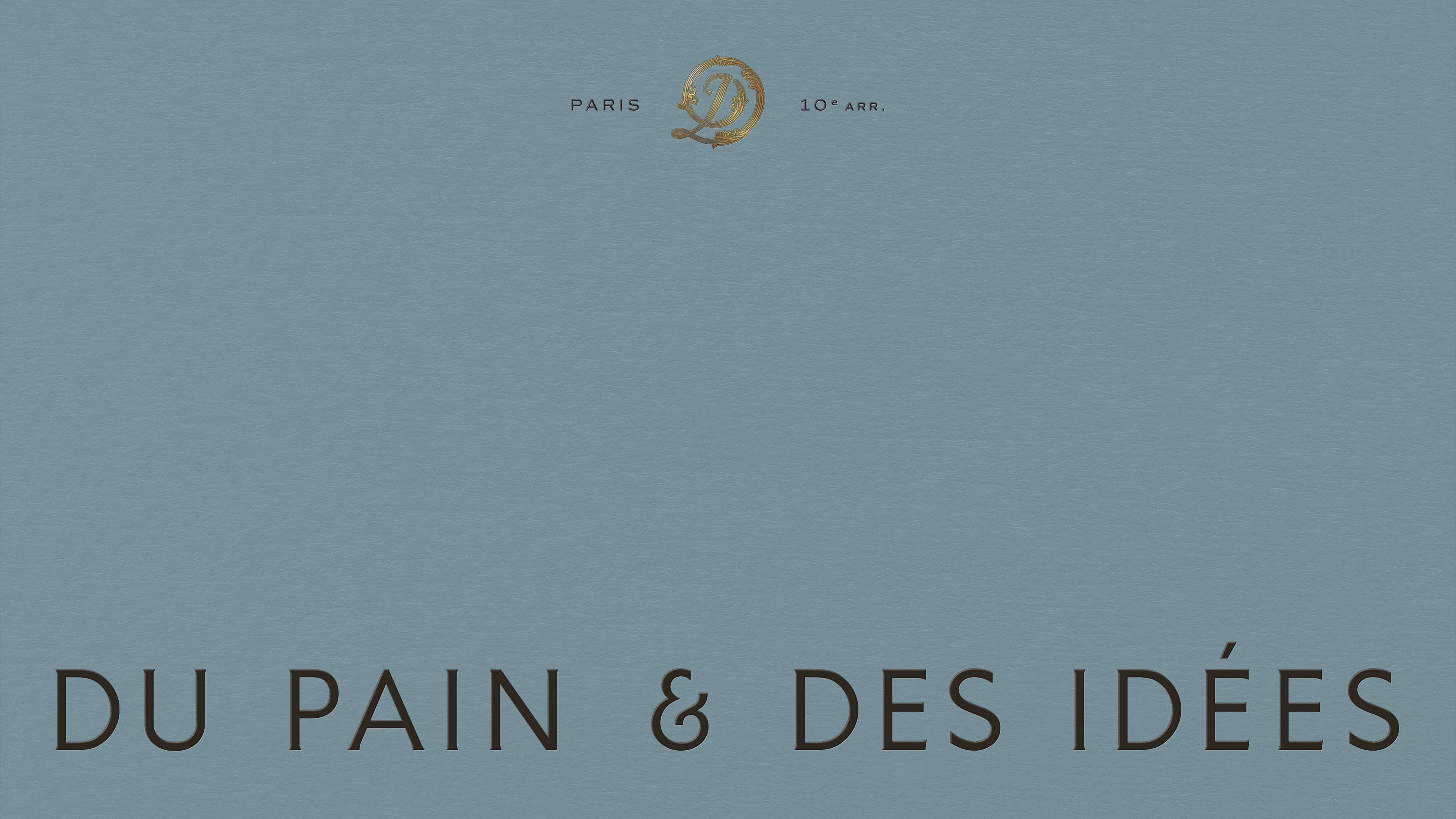 En parallèle, un monogramme incarne la facette patrimoniale. Inspiré des décors XIXᵉ de la boutique, il entrelace les lettres D, P, D, I au cœur de volutes et de feuilles d'acanthe. De plus, ce travail de gravure dessine subtilement la forme de l'escargot pistache-chocolat, viennoiserie iconique de la maison.